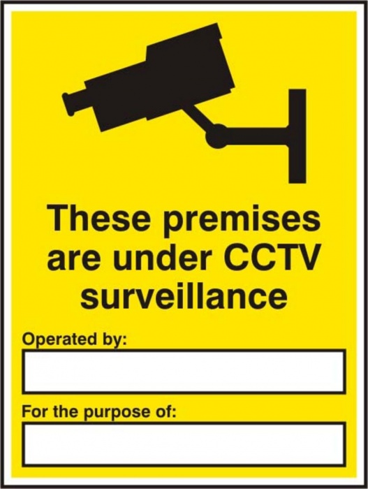 Yellow CCTV surveillance sign with black camera symbol reading – These premises are under CCTV surveillance, featuring blank white boxes to write operator and purpose.