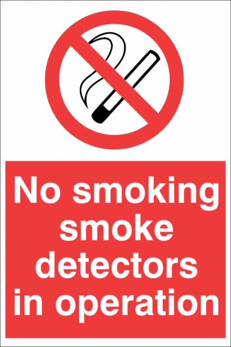 Red and white smoking/no smoking sign, reading No smoking smoke detectors in operation, with red prohibiton sign through a cigarette.